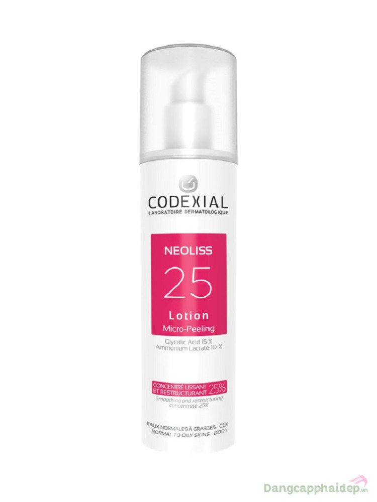 Codexial Neoliss 25 Lotion là sản phẩm chăm sóc da đến từ thương hiệu dược mỹ phẩm Codexial - Pháp, được thiết kế dành riêng cho làn da thường đến da dầu gặp tình trạng khô ráp, sần sùi.