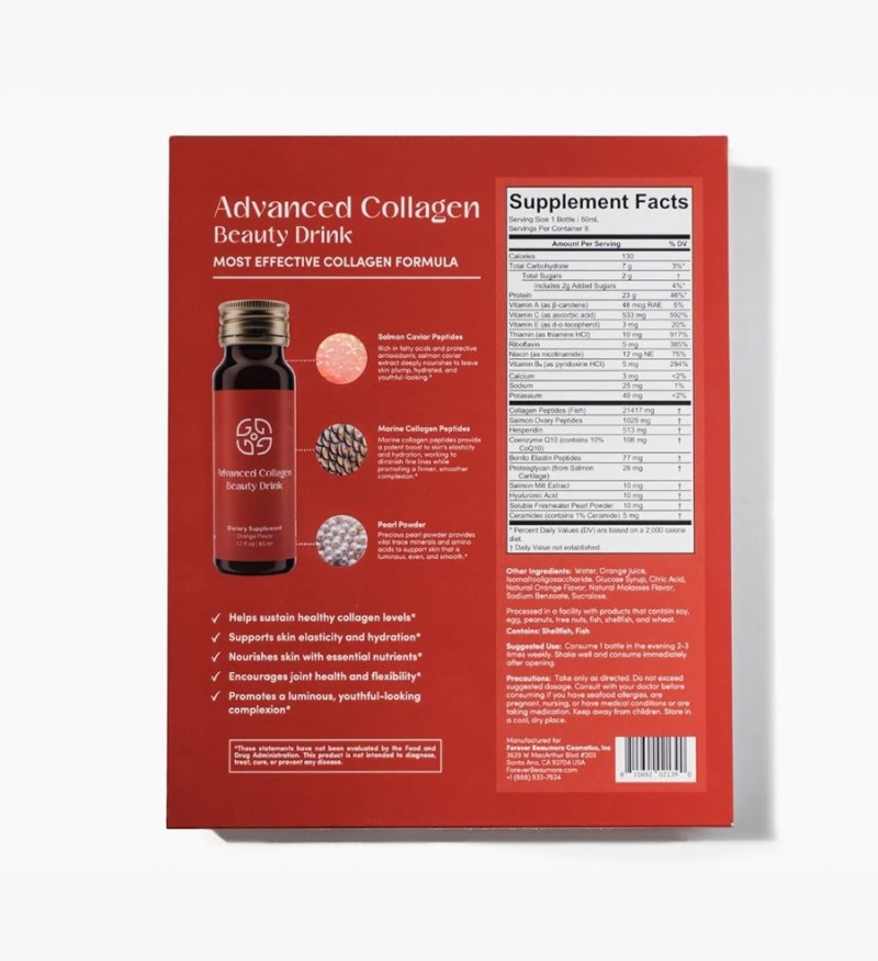 Collagen Glamore Caviar được bào chế với hàm lượng collagen tinh khiết cao nhất hiện nay (21.376,29mg/50ml), kết hợp cùng tinh chất từ xương sụn mũi cá mập, elastin từ động mạch chủ cá ngừ và đặc biệt là chiết xuất từ nhau trứng cá hồi, mang đến nguồn dinh dưỡng dồi dào cho cơ thể và làn da. Nước uống được đóng gói trong hộp 8 chai, mỗi chai 50ml, tiện lợi và dễ sử dụng. Hương vị cam tươi mát, dễ uống cũng là điểm cộng lớn của sản phẩm.