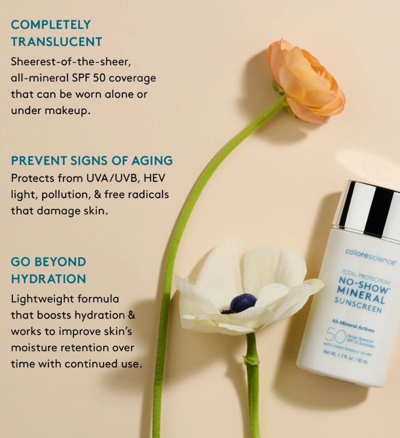 Bên cạnh đó, Colorescience No-Show SPF 50 còn nổi bật nhờ công thức không màu, trong suốt, không gây vệt trắng, không làm lệch tông da, phù hợp với mọi giới tính và tông da. Kết cấu mỏng nhẹ như không, thấm nhanh, không bít tắc lỗ chân lông – lý tưởng để dùng hằng ngày, kể cả dưới lớp trang điểm hoặc dùng đơn lẻ cho làn da tự nhiên.