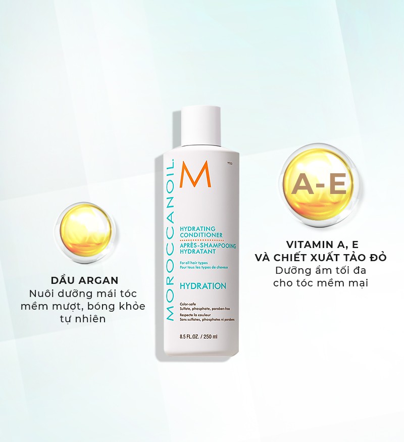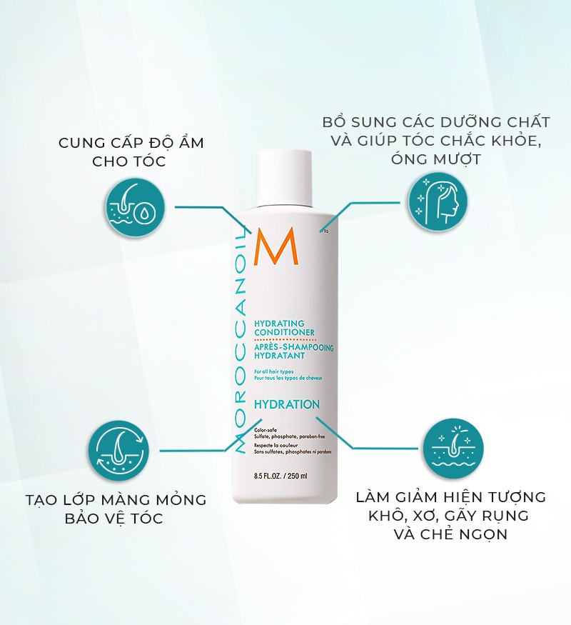 Điều đặc biệt của sản phẩm dầu xả Moroccanoil là dưỡng ẩm tóc mà không gây bết. Không chứa sulfate, phosphate và paraben