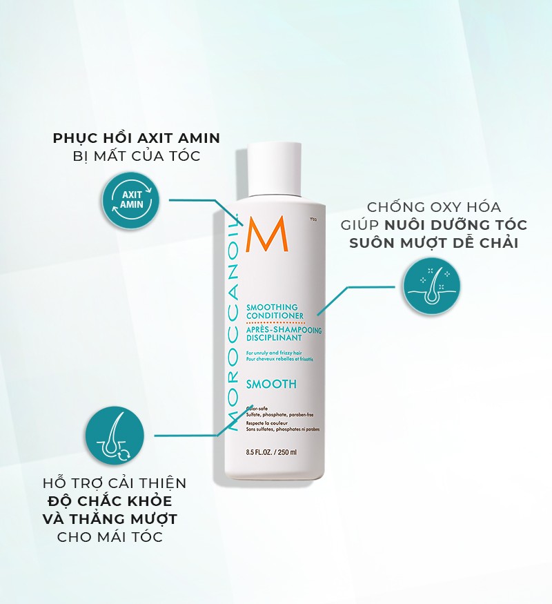 Moroccanoil Smoothing Conditioner là dòng dầu xả được tạo nên bởi công thức dưỡng ẩm và chống rối nhẹ nhàng, từ đó giúp chế ngự và làm suôn mượt mái tóc rối khó vào nếp. Thành phần AminoRenew™ độc quyền giúp phục hồi lượng axit amin bị mất để thẳng cấu trúc keratin tự nhiên của tóc từ đó giúp tóc chắc khỏe hơn.