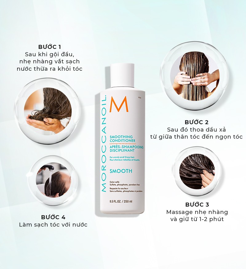 Tóc rối và khó vào nếp một phần là do tóc quá khô, xơ. Chỉ cần sử dụng dầu xả suôn mượt Smoothing Conditioner của thương hiệu Moroccanoil chính hãng thường xuyên sau mỗi lần gội, bạn sẽ thấy tóc mềm mượt hơn đáng kể. Đặc biệt, mái tóc khô rối sẽ giàu sức sống và trở nên đáng yêu chưa từng có.