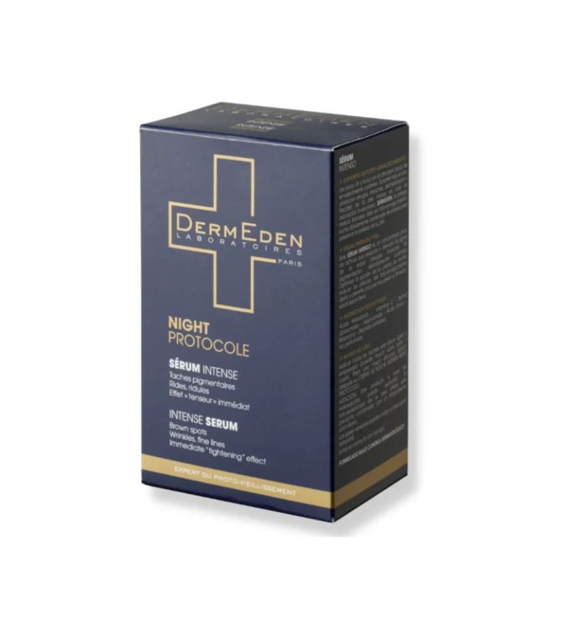 DermEden Night Protocole Intense Serum là một siêu huyết thanh ban đêm đến từ Pháp của thương hiệu DermEden Laboratoires, được bào chế dưới sự giám sát của các bác sĩ da liễu, với mục tiêu tận dụng thời điểm vàng – ban đêm – để kích hoạt quá trình phục hồi và tái tạo sâu trong da. Công thức mạnh mẽ chứa đến 14.5% hoạt chất chống lão hóa đã được kiểm nghiệm lâm sàng, tác động trực tiếp đến các vấn đề như nếp nhăn, da chảy xệ, đốm sắc tố và mất nước.