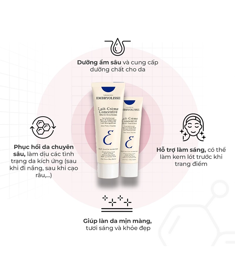 Kem dưỡng ẩm Embryolisse Lait-Crème Concentré là sản phẩm "must-have" của các chuyên gia trang điểm và người nổi tiếng trên toàn thế giới. Với công thức độc đáo, sản phẩm không chỉ dưỡng ẩm sâu mà còn mang lại nhiều công dụng tuyệt vời khác cho làn da.