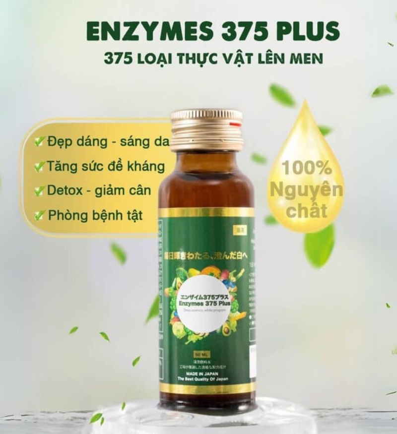 Enzymes 375 Plus là một sản phẩm nước detox giảm cân hàng đầu từ Nhật Bản, được chiết xuất từ 375 loại rau, củ, quả và thảo dược lên men tự nhiên. Sản phẩm này không chỉ cung cấp chất xơ, vitamin và khoáng chất cho cơ thể mà còn hỗ trợ tiêu hóa, giảm hấp thụ chất béo, giúp thải độc cơ thể và cải thiện sức khỏe toàn diện.