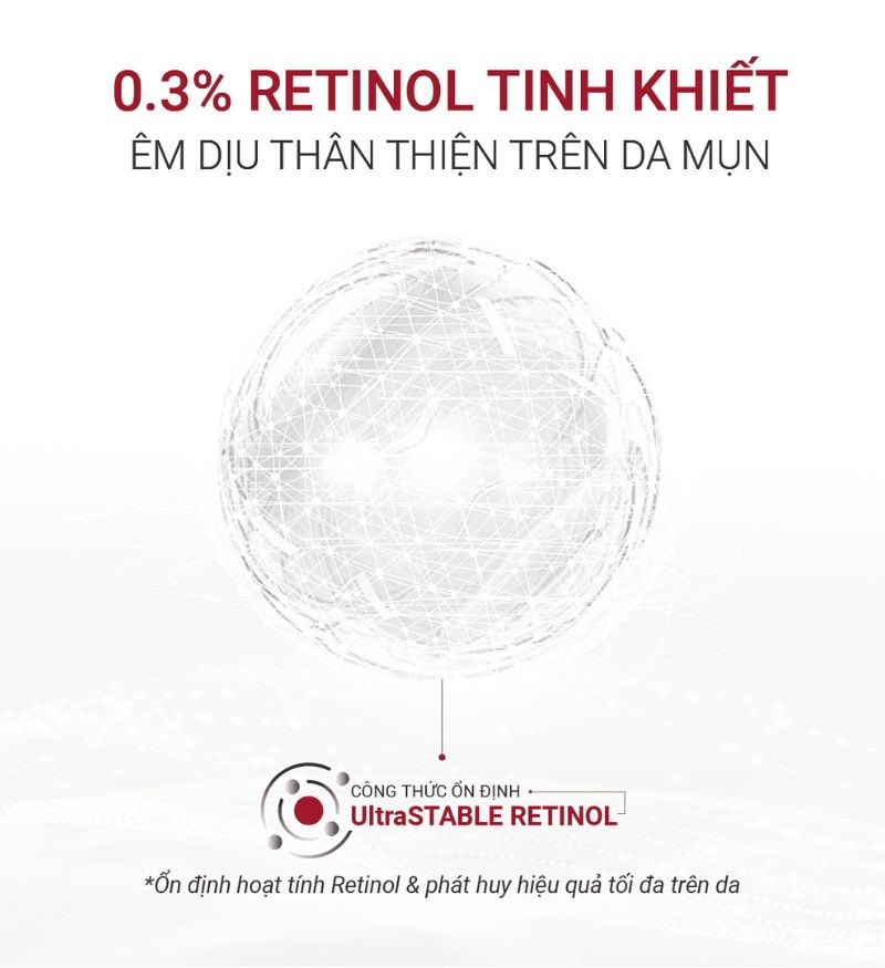 Retinol tinh khiết 0.3%: Hoạt chất “vàng” trong chăm sóc da giúp thúc đẩy tái tạo tế bào, cải thiện mụn, thâm và nếp nhăn, mang lại làn da mịn và săn chắc hơn theo thời gian.