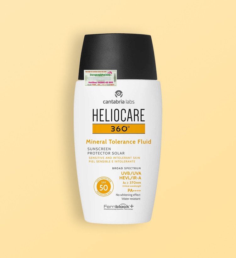 Heliocare 360 Mineral Tolerance Fluid SPF 50 của Heliocare sở hữu 100% màng lọc khoáng và công thức chứa hoạt chất Fernblock®+ bảo vệ vượt trội hơn so với công thức cũ, đáp ứng các tiêu chuẩn cao nhất về bảo vệ da chống lại ánh sáng mặt trời. Nhờ đó, có khả năng bảo vệ da toàn diện khỏi các tia gây hại UVA, UVB, ánh sáng nhìn thấy (Hevis), tia hồng ngoại (IR-A). Ngoài chống nắng phổ rộng ưu việt, sản phẩm còn được tăng cường tác dụng chống oxy hóa, và hoạt tính sửa chữa các tổn thương do ánh nắng, như tổn thương DNA và lão hóa da sớm.