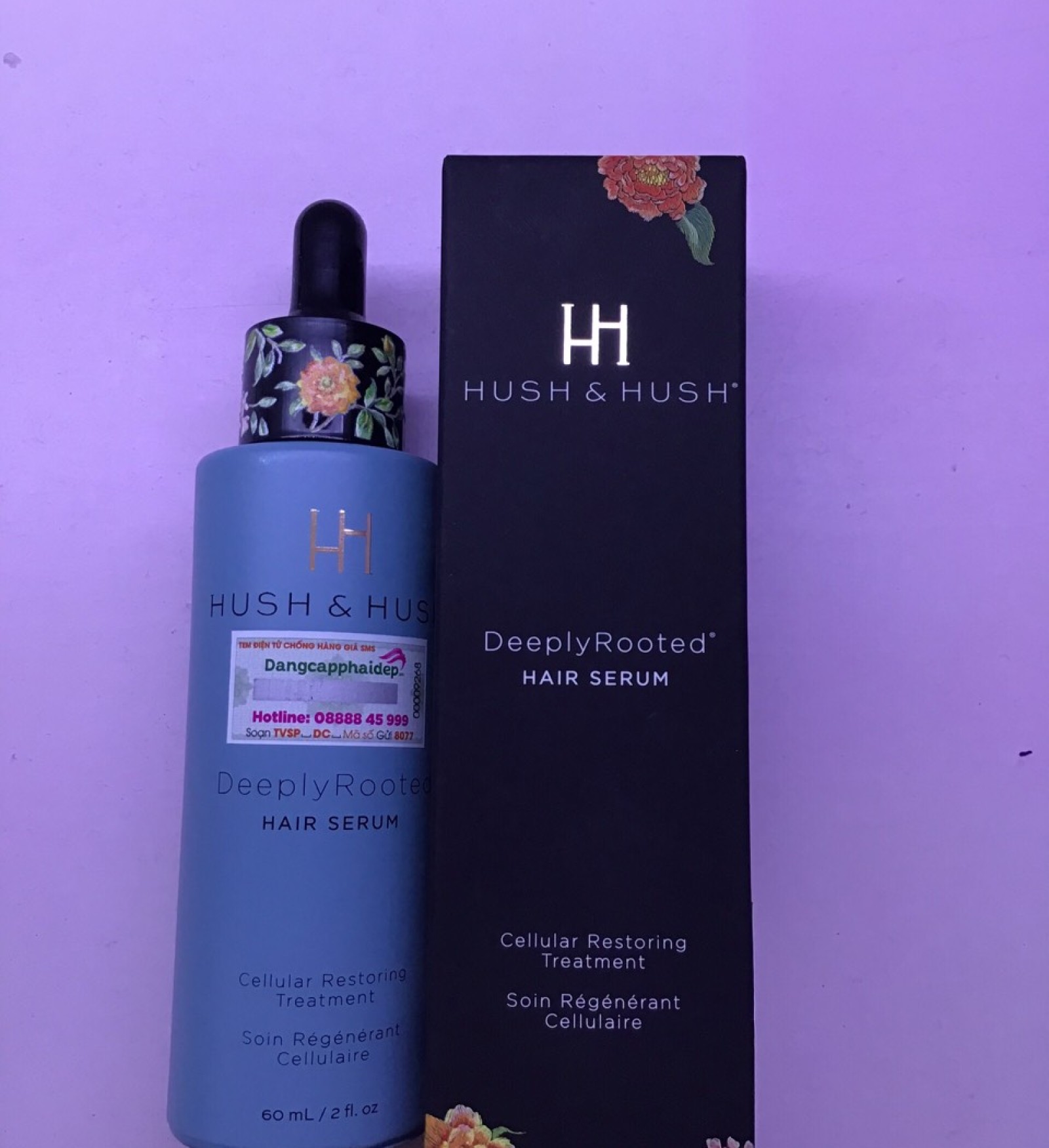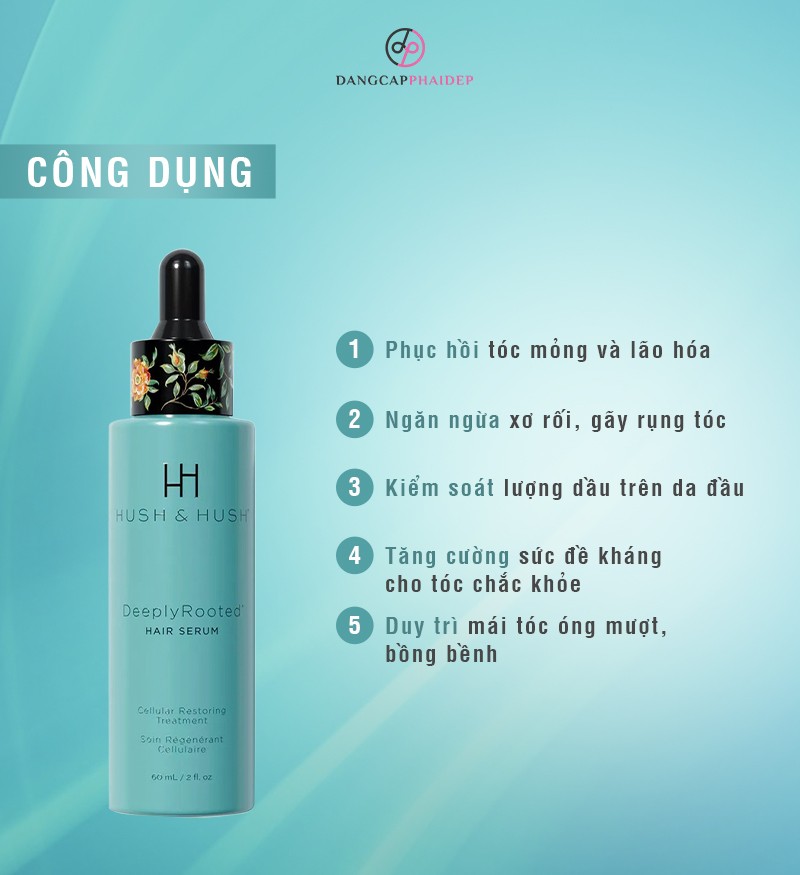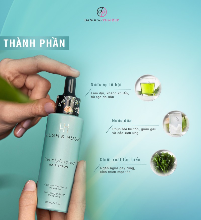 Hush and Hush DeeplyRooted Hair Serum gia tăng 78% sự phát triển của mái tóc. Giảm 33,3% lượng tóc rụng trong quá trình thử kéo (chải). Thúc đẩy quá trình tái tạo nang tóc trở nên khỏe mạnh hơn rõ rệt. Hush and Hush DeeplyRooted Hair Serum là sản phẩm của thương hiệu Hush & Hush. Đây là thương hiệu nổi tiếng hàng đầu tại Mỹ với các sản phẩm chăm sóc mái tóc, làn da và hỗ trợ cải thiện sức khoẻ.
