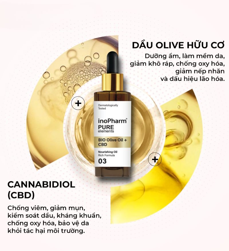Tinh dầu làm dịu, dưỡng ẩm & trẻ hóa làn da InoPharm CBD + Bio Olive Oil 30ml là giải pháp chăm sóc chuyên sâu cho làn da mệt mỏi, khô và có dấu hiệu lão hóa. Được phát triển bởi thương hiệu InoPharm, tinh dầu đã được kiểm nghiệm da liễu, an toàn cho mọi loại da.