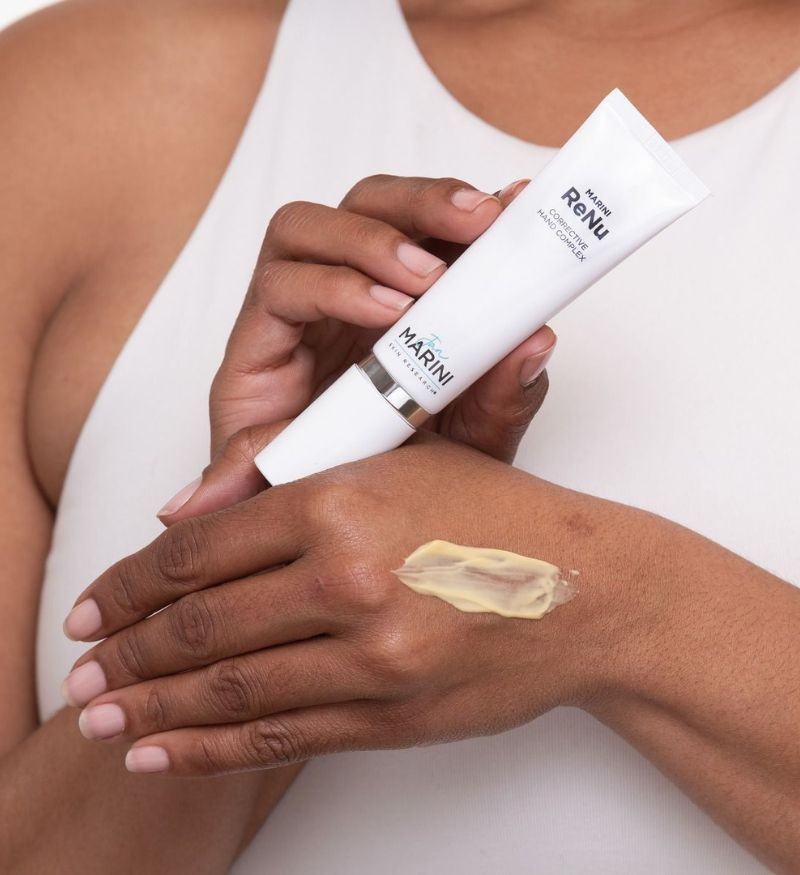 Jan Marini ReNu Corrective Hand Complex là sản phẩm chăm sóc da tay chuyên sâu đến từ thương hiệu Jan Marini (Mỹ). Sản phẩm sở hữu công thức độc quyền được cấp bằng sáng chế nhằm cải thiện các dấu hiệu lão hóa rõ rệt trên mu bàn tay. Đôi bàn tay vốn thường xuyên tiếp xúc với ánh nắng và hóa chất nên dễ xuất hiện nếp nhăn, đốm đồi mồi và kết cấu da thô ráp. ReNu Corrective Hand Complex ứng dụng phương pháp đa chiều thông qua sự kết hợp của Retinol, Alpha Arbutin, Axit Azelaic và Vitamin C giúp làm sáng tông màu da, hỗ trợ mờ thâm nám, nếp nhăn và tinh chỉnh bề mặt da mịn màng hơn mà không cần sử dụng Hydroquinone.
