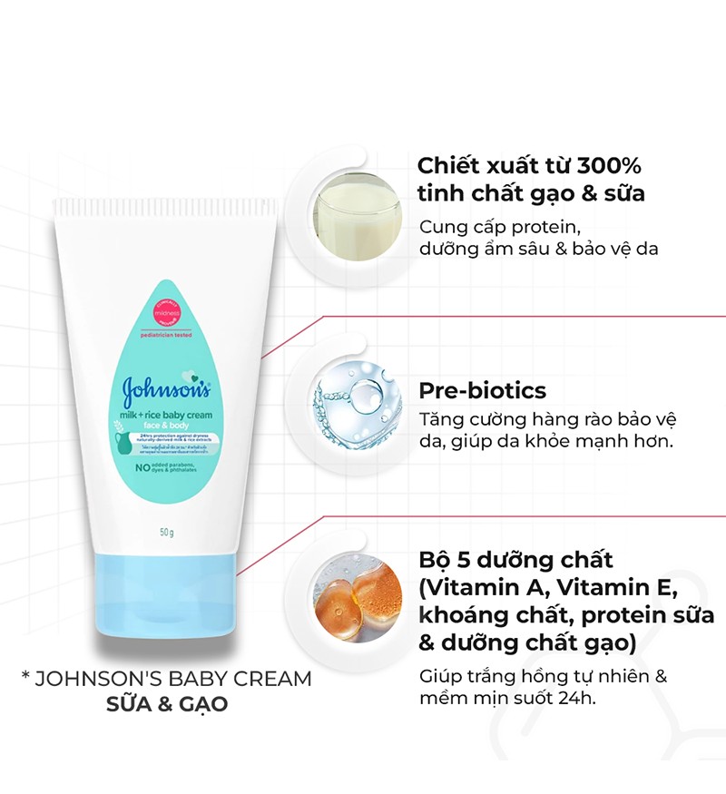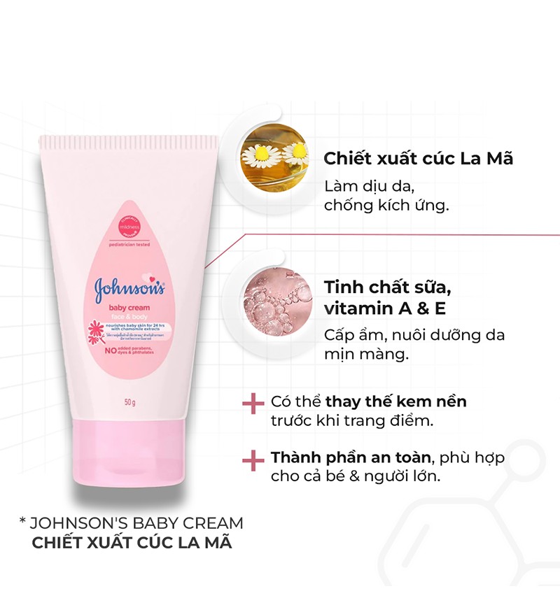 Sản phẩm có thành phần dịu nhẹ, không gây kích ứng da và phù hợp với làn da nhạy cảm của bé. Kem dưỡng ẩm Johnson's Baby Cream giúp dưỡng ẩm suốt 24 giờ, bảo vệ da bé khỏi tình trạng khô ráp, nứt nẻ.