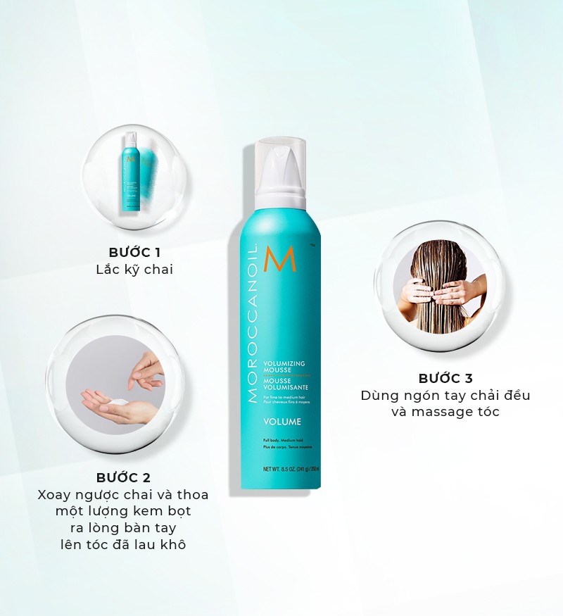 Để sử dụng hiệu quả kem bọt tạo phồng Moroccanoil Volumizing Mousse, hãy thực hiện đầy đủ các bước sau đây: