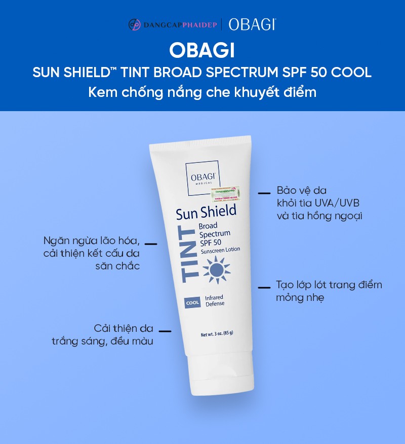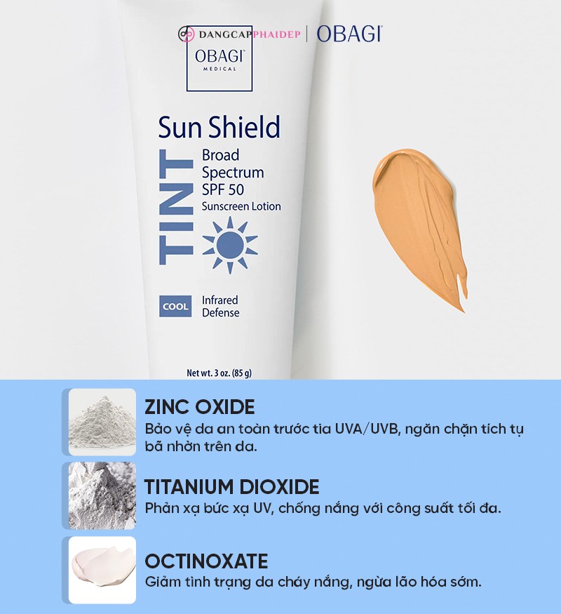 Kem chống nắng Sunshield Tint Broad Spectrum SPF 50 Cool là giải pháp bảo vệ da tối ưu, giúp chống nắng phổ rộng, che phủ khuyết điểm, dưỡng da trắng hồng và mang đến làn da mềm mại, tươi tắn. Sản phẩm đến từ thương hiệu dược mỹ phẩm Obagi Medical - Mỹ, nổi tiếng với các dòng sản phẩm chăm sóc da chuyên sâu, được nghiên cứu và phát triển bởi đội ngũ bác sĩ da liễu hàng đầu.