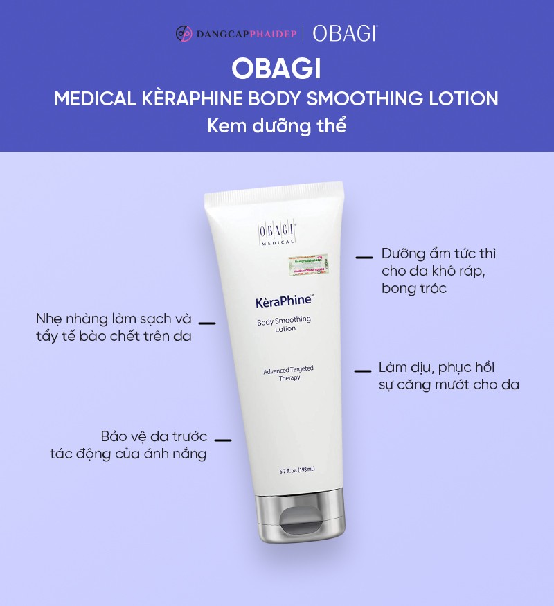 Obagi Kèraphine Body Smoothing Lotion 198g là kem dưỡng thể đến từ thương hiệu dược mỹ phẩm Obagi Medical - Mỹ, nổi tiếng với hiệu quả loại bỏ tế bào chết và dưỡng ẩm chuyên sâu.