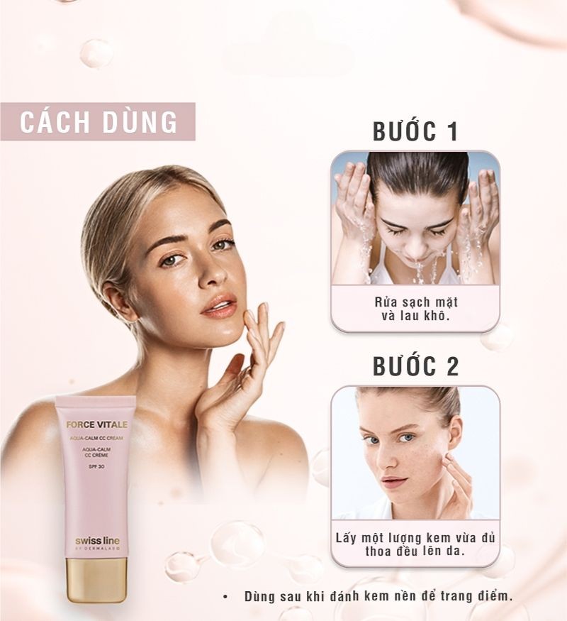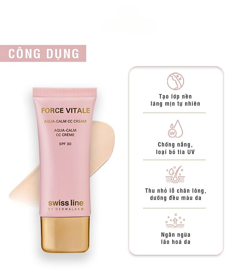 Aqua - Calm CC Cream SPF30 Beige 10 nằm trong dòng Force Vitale nổi tiếng của thương hiệu Swissline với khả năng vượt trội trong việc giải quyết tình trạng mất nước, nhạy cảm và dầu nhờn của da.
