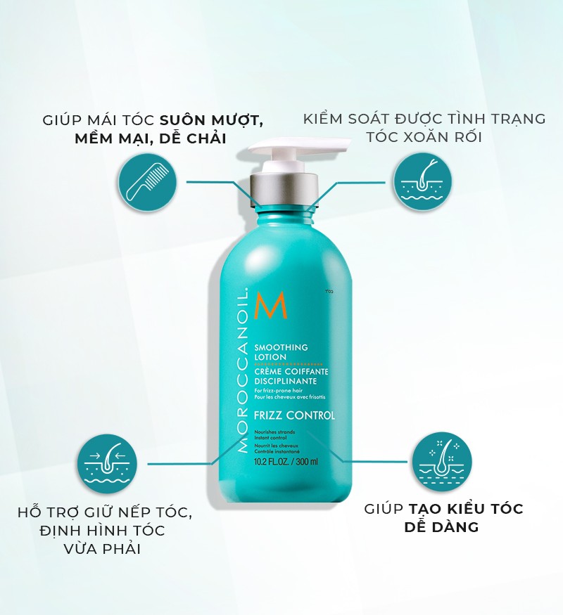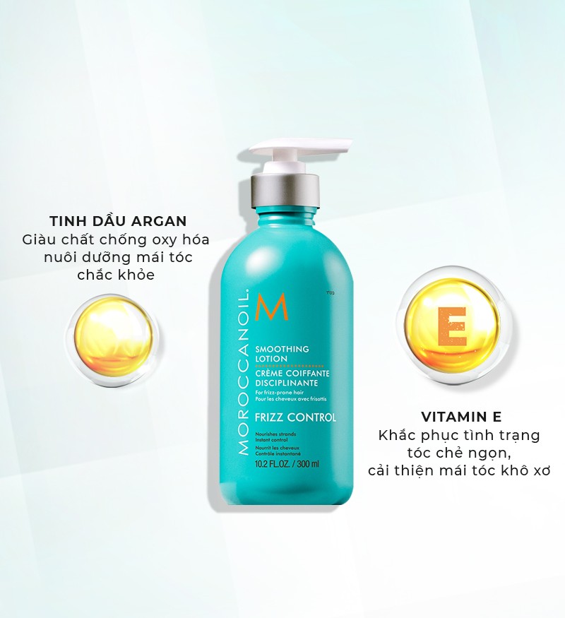 Moroccanoil Smoothing Lotion được chiết xuất bằng công nghệ phối trộn chuyên nghiệp chứa dầu argan, bơ argan, vitamin E, axit béo thiết yếu…cùng công thức nhẹ nhàng, giúp chống xoăn rối tóc hiệu quả, giữ nếp và định hình tóc vừa phải. Đồng thời hỗ trợ chống ẩm, giữ gìn mái tóc mềm mại, suôn mượt và dễ chải hơn.