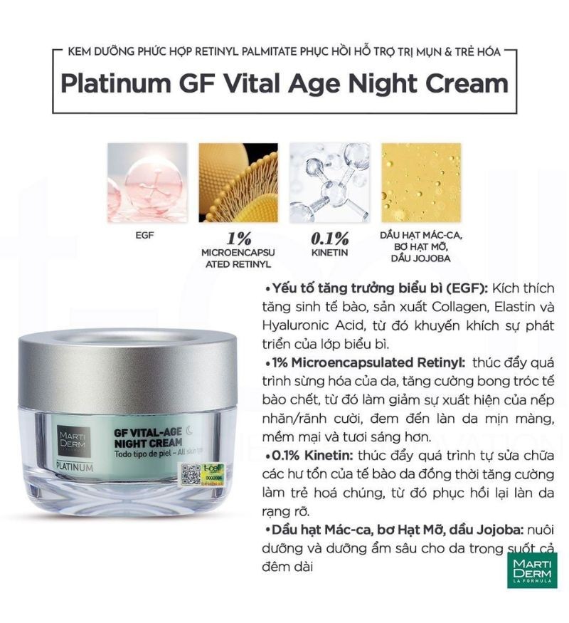MartiDerm Platinum GF Vital Age Night Cream là sản phẩm kem dưỡng ẩm ban đêm cao cấp đến từ thương hiệu MartiDerm nổi tiếng của Tây Ban Nha. Sản phẩm được thiết kế trong lọ 50ml sang trọng, tiện lợi, phù hợp cho mọi loại da. Công thức đặc biệt của kem chứa phức hợp Retinyl Palmitate và yếu tố tăng trưởng biểu bì EGF (Epidermal Growth Factor), giúp tăng sinh collagen và thúc đẩy tính đàn hồi của lớp hạ bì.