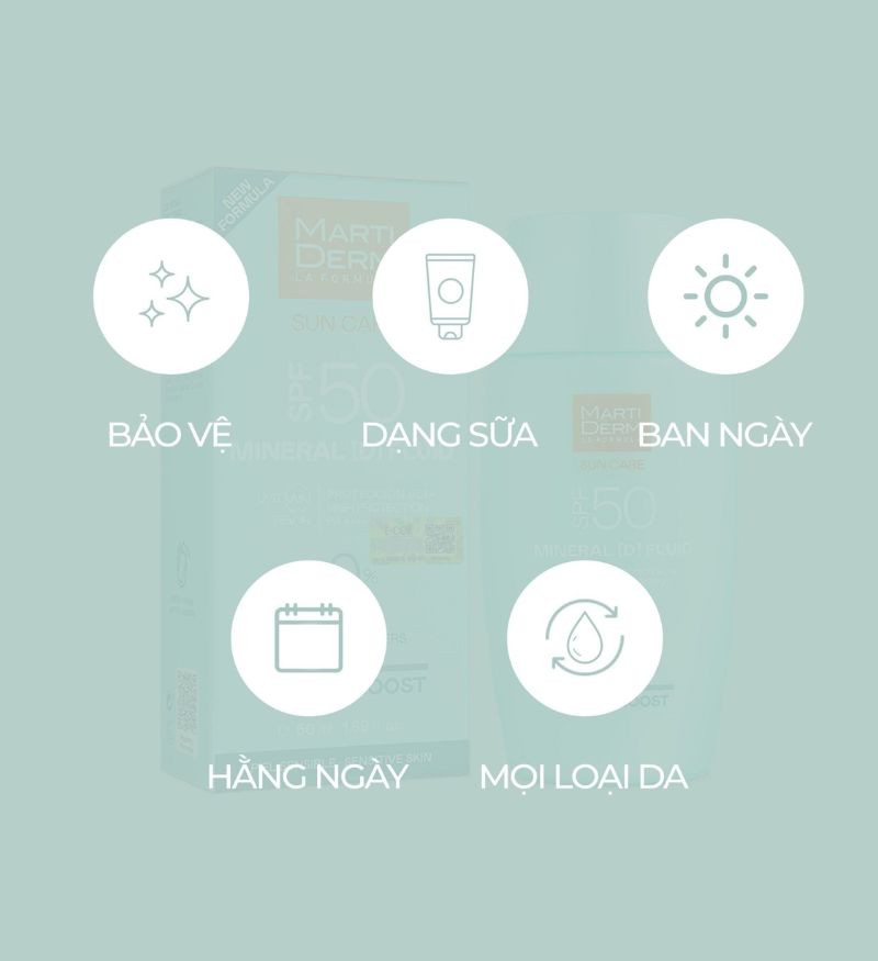 Điểm nổi bật của kem chống nắng MartiDerm SPF 50 Mineral [D] Fluid là khả năng chống ánh sáng xanh (HEV) và hỗ trợ phục hồi chức năng biểu bì tương tự cơ chế của Vitamin D. Với kết cấu dạng lỏng mỏng nhẹ, kem thẩm thấu tức thì mà không để lại vệt trắng hay cảm giác nhờn rít khó chịu.