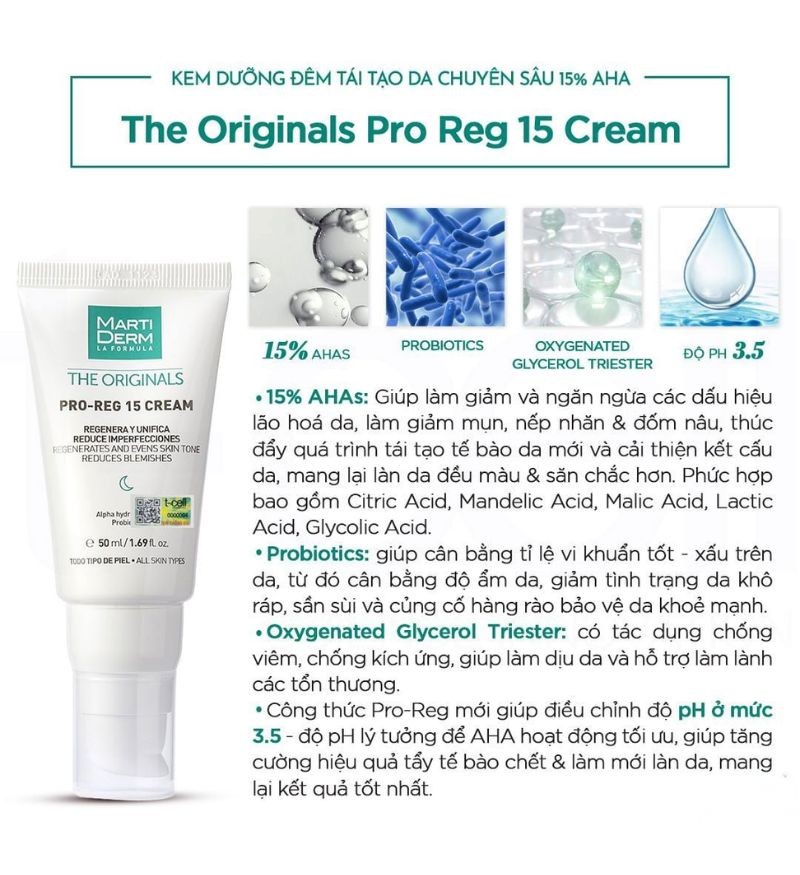 MartiDerm The Originals Pro-Reg 15 Cream là kem dưỡng tái tạo da nồng độ cao đến từ thương hiệu dược mỹ phẩm MartiDerm (Tây Ban Nha). Sản phẩm sở hữu công thức cải tiến chứa 15% phức hợp Alpha Hydroxy Acids (AHA) đa dạng kết hợp cùng hệ lợi khuẩn Probiotics giúp thúc đẩy quá trình đổi mới tế bào. Với độ pH 3.5 lý tưởng, kem dưỡng tối ưu hóa khả năng tẩy tế bào chết hóa học, giúp loại bỏ lớp sừng già cỗi mà vẫn đảm bảo tính ổn định cho cấu trúc da.
