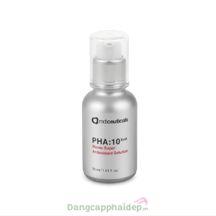 Md:ceuticals PHA:10Xvit Bionic Super Antioxidant Solution tích cực chống lão hóa, dưỡng ẩm và làm sáng da vượt trội nhờ sự kết hợp hoàn hảo giữa axit PHA thế hệ mới cùng phức hợp đa vitamin A + E. Ngoài ra các thành phần này tác động "thần kỳ" lên làn da, giúp tẩy tế bào chết, chống oxy hóa, kích thích sản sinh collagen và cải thiện kết cấu da.