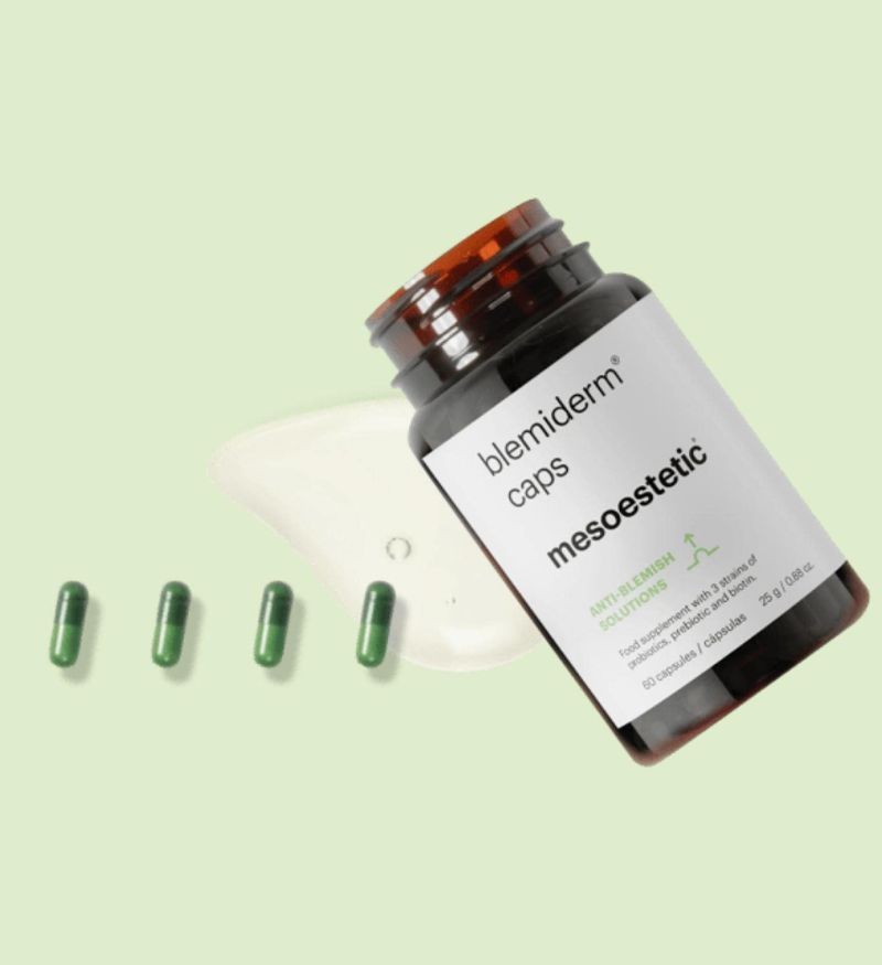 Mesoestetic Blemiderm® Caps là viên uống bổ sung được thiết kế đặc biệt dành cho làn da mụn và không khỏe mạnh đến từ thương hiệu dược mỹ phẩm Mesoestetic - Tây Ban Nha. Với công thức độc đáo chứa Probiotics, Prebiotics, Biotin và Kẽm, sản phẩm tác động từ sâu bên trong, cân bằng hệ vi sinh vật đường ruột – yếu tố quan trọng ảnh hưởng trực tiếp đến sức khỏe làn da, giúp ngăn ngừa mụn hình thành và cải thiện tình trạng da tổng thể.