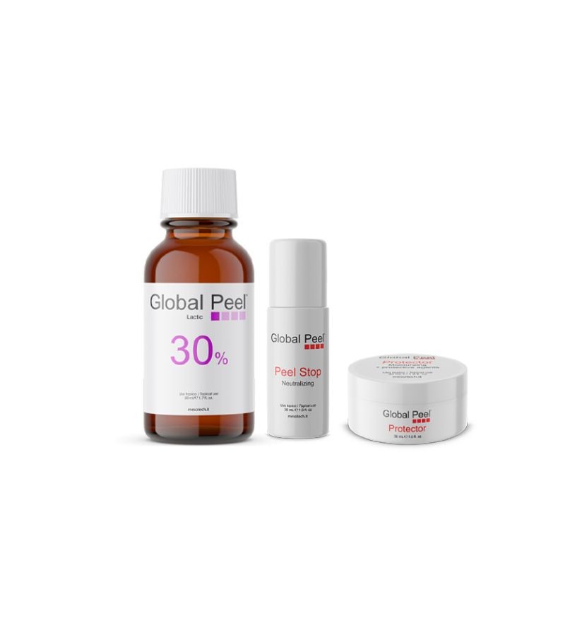 Bộ sản phẩm được đóng gói gồm: 1 chai Peel Global Peel Lactic 30% 50 ml + 1 protector 10 ml + 1 Peel Stop 25 ml.
