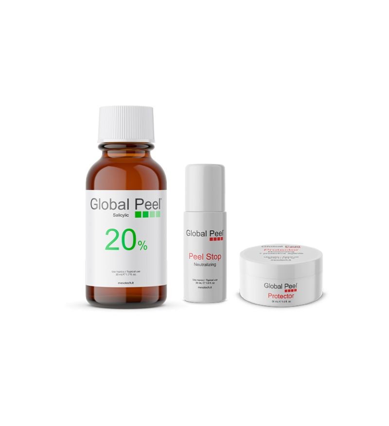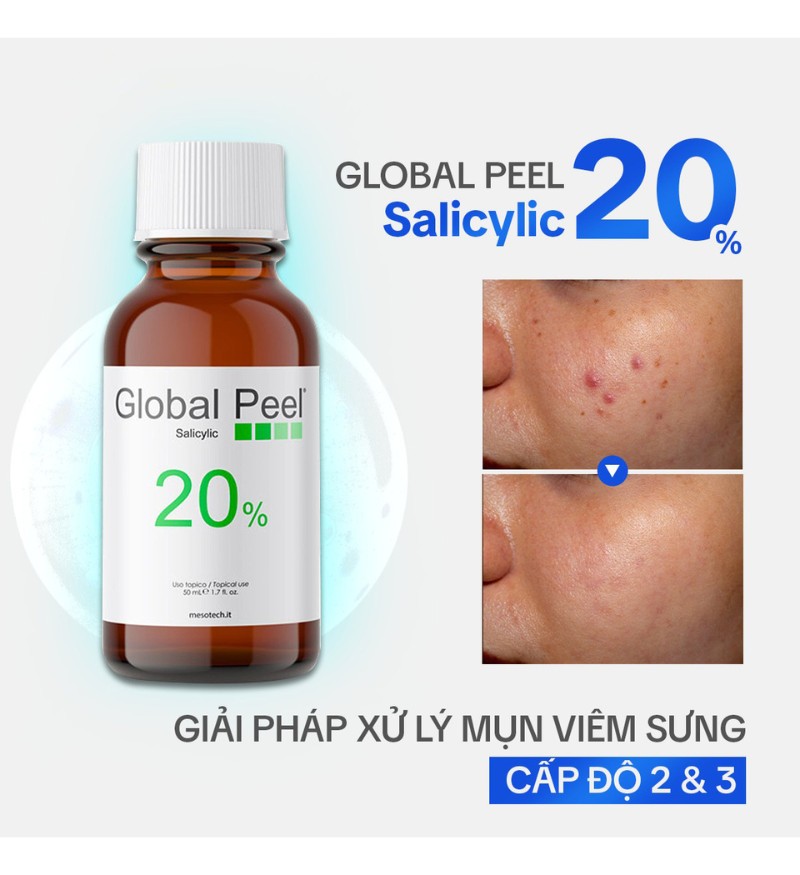 Global Peel Salicylic 20% là dòng dung dịch lột tẩy đặc trị đến từ thương hiệu Mesotech nổi tiếng của Ý, chuyên biệt trong việc chăm sóc và điều trị các vấn đề về da. Sản phẩm được đóng gói gồm một chai Peel Salicylic 20% dung tích 50ml, một chai Protector 10ml và một chai Peel Stop 25ml, mang lại giải pháp toàn diện cho da mụn cấp độ 2 và 3.