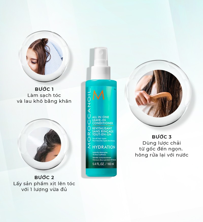 Xịt xả khô Moroccanoil All in One Leave-In Conditioner thích hợp cho mọi loại tóc với khả năng gỡ rối tóc nhanh chóng, hỗ trợ cấp ẩm, dưỡng tóc bóng khỏe, mềm mượt tự nhiên. Để tối ưu hiệu quả sử dụng, hãy thực hiện đúng các bước sau đây: