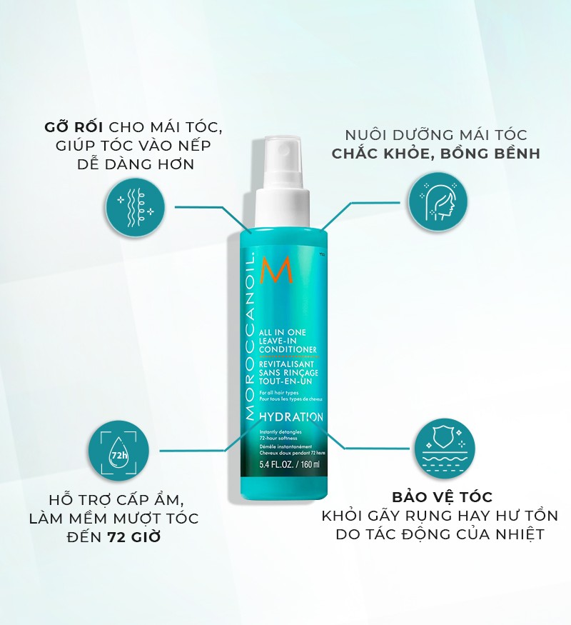 Có thể bạn không tin nhưng tất cả các bước dưỡng, phục hồi và bảo vệ mái tóc đều có trong sản phẩm xịt đa nhiệm này. Moroccanoil All in One Leave-In Conditioner ngay lập tức có thể gỡ rối cho mái tóc, hỗ trợ cấp ẩm, bảo vệ mái tóc khỏi tình trạng gãy rụng, hư tổn do nhiệt. Đồng thời nuôi dưỡng và giữ cho mái tóc bóng mượt, bồng bềnh suốt 72 giờ. Sản phẩm dạng “leave in conditioner” như kiểu dầu xả không cần xả lại với nước. Vì không dùng chất tạo mùi nhân tạo nên sản phẩm có mùi hương tự nhiên rất dễ chịu khi sử dụng.
