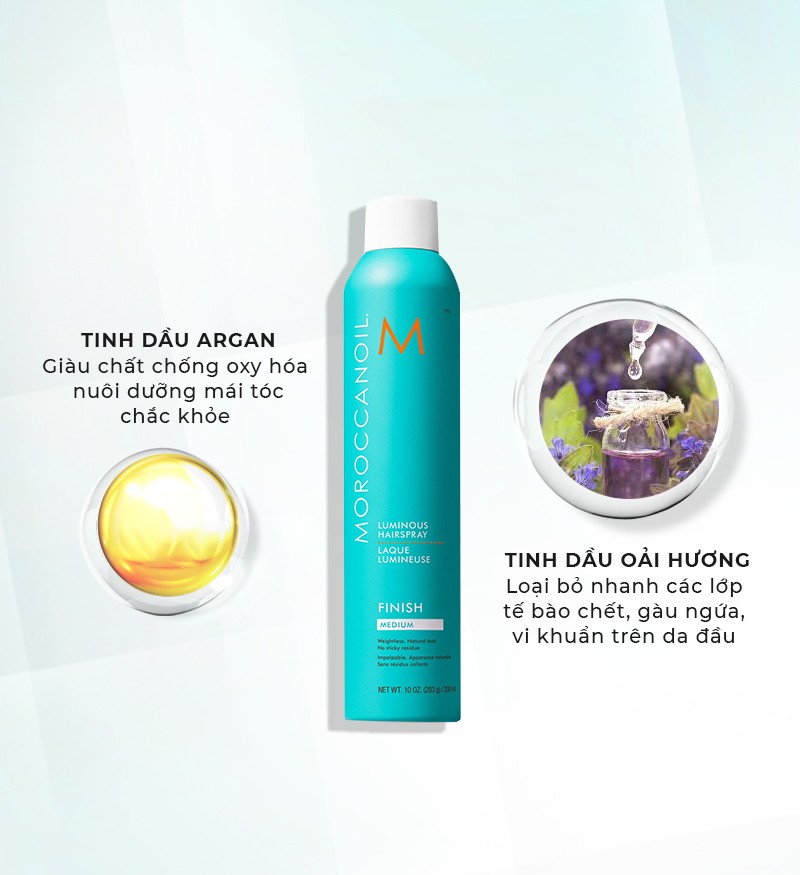 Xịt bóng giữ nếp tóc Moroccanoil Luminous Hairspray Medium chính là giải pháp hiệu quả, đơn giản cho mái tóc vào nếp mà vẫn nhẹ nhàng, tự nhiên. Khác với gel tạo kiểu truyền thống, sản phẩm Moroccanoil chính hãng này tạo một lớp bảo vệ sáng bóng cho tóc, giúp mái tóc giữ nếp lâu dài mà không làm tóc khô hay cứng. Với chiết xuất từ tinh dầu Argan, Moroccanoil Luminous Hairspray Medium cung cấp độ ẩm và chất chống oxy hóa cho tóc, hạn chế tình trạng gãy rối.