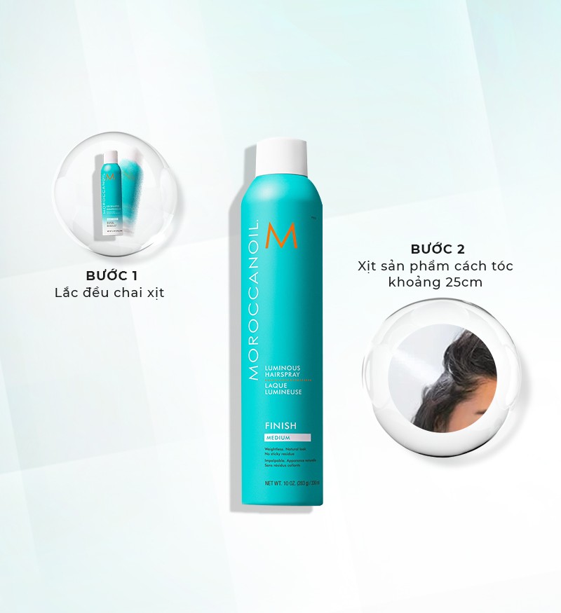 Xịt bóng giữ nếp vừa Moroccanoil Luminous Hairspray Medium giúp giữ nếp tóc lâu dài, bồng bềnh, tạo lớp màng bảo vệ sáng bóng cho tóc. Để phát huy tối đa hiệu quả, hãy sử dụng đúng theo các bước sau đây: