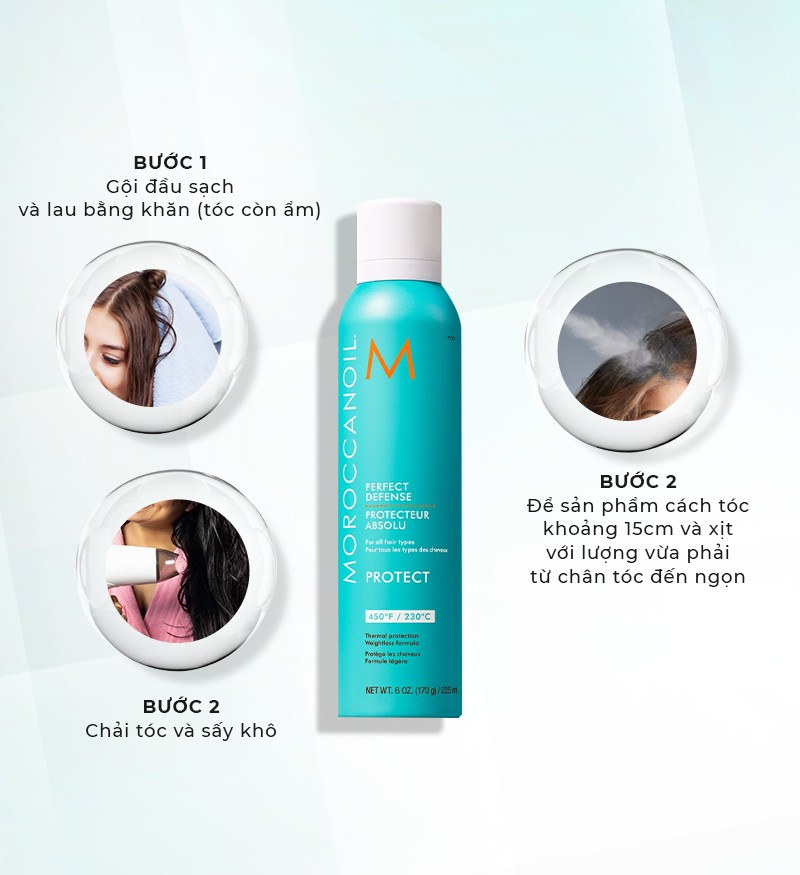 Xịt tóc Moroccanoil Perfect Defense với khả năng chống nhiệt, bảo vệ tóc đến 230oC, đồng thời bổ sung độ ẩm và ngăn ngừa rụng tóc. Để sản phẩm phát huy tối đa công dụng, bạn nên thực hiện đầy đủ theo các bước sau.