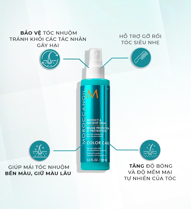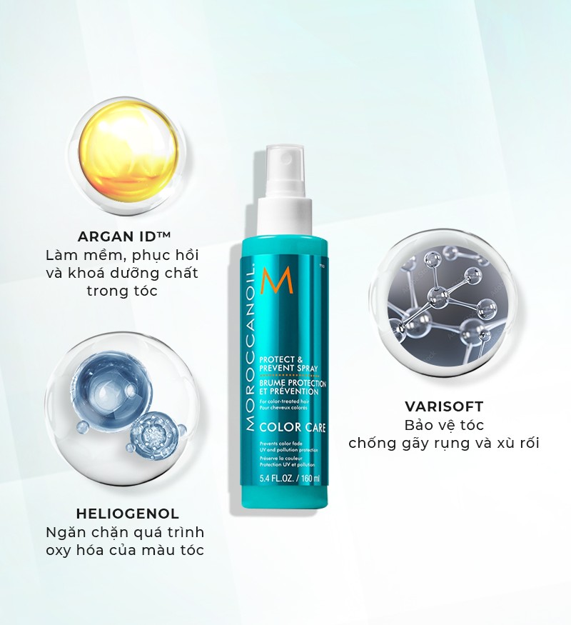 Đặc biệt, xịt bảo vệ dưỡng tóc Moroccanoil Protect & Prevent Spray nổi tiếng của Moroccanoil được ứng dụng những công thức ưu việt, chiết xuất từ thành phần tự nhiên lành tính như Argan ID, Varisoft, Heliogenol…để chăm sóc tóc nhuộm khỏe đẹp bền lâu. Với công thức xả khô siêu nhẹ; cùng công nghệ siêu vi Argan ID giúp phục hồi và khoá biểu bì. Đưa dầu argan vào tới lớp vỏ tóc cortex và khoá giữ màu hiệu quả. Theo kết quả đã được chứng minh khoa học; chỉ sau 10 lần sử dụng trọn bộ Color Complete, mái tóc tăng độ bền màu; và độ rực rỡ của màu nhuộm đến 100%.