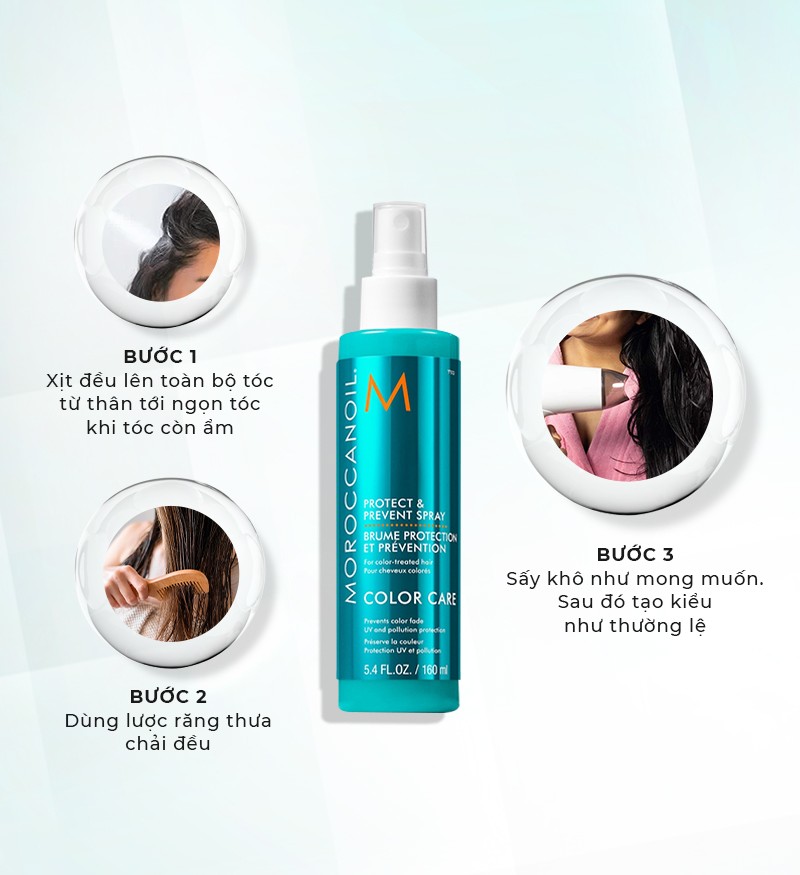 Xịt bảo vệ giữ màu tóc nhuộm Moroccanoil Protect & Prevent Spray giúp bảo vệ mái tóc nhuộm khỏi các tác nhân gây hại từ bên ngoài như ánh nắng, khói bụi... đồng thời giữ màu tóc nhuộm bền màu, lâu phai. Để phát huy tối đa công dụng của xịt bảo vệ tóc Moroccanoil bạn cần thực hiện đùng theo các bước hướng dẫn sau.