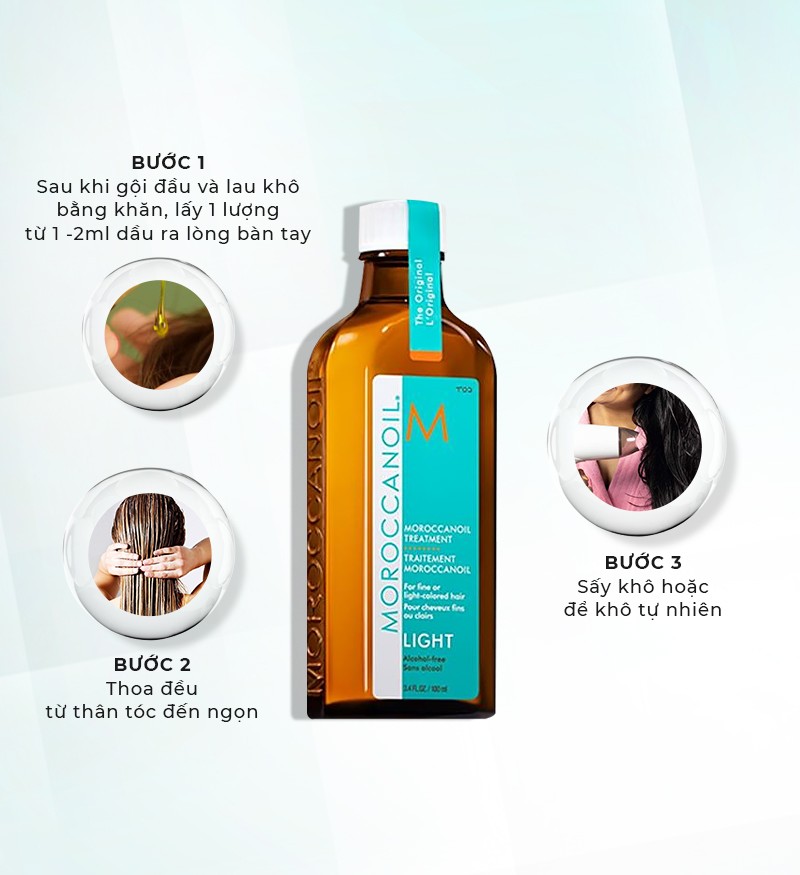 Tinh dầu dưỡng tóc Moroccanoil với các thành phần dưỡng chất cao hấp thụ vào tóc ngay tức thì mang đến mái tóc óng ả, bồng bềnh. Để sản phẩm mang đến công dụng tối đa, bạn nên thực hiện đầy đủ theo các bước sau.