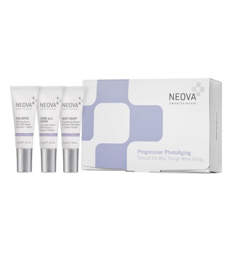 Bộ Kit Neova Progressive PhotoAging là giải pháp "cứu tinh" cho làn da lão hóa sớm, giúp loại bỏ tế bào hư tổn, phục hồi cấu trúc da, dưỡng ẩm và mang đến làn da căng mịn, trắng sáng, rạng rỡ. Sản phẩm đến từ thương hiệu dược mỹ phẩm cao cấp Neova - Mỹ, nổi tiếng với các dòng sản phẩm chăm sóc da chứa phức hợp đồng Cu độc quyền, được nghiên cứu và phát triển bởi đội ngũ chuyên gia hàng đầu.