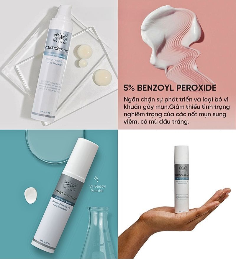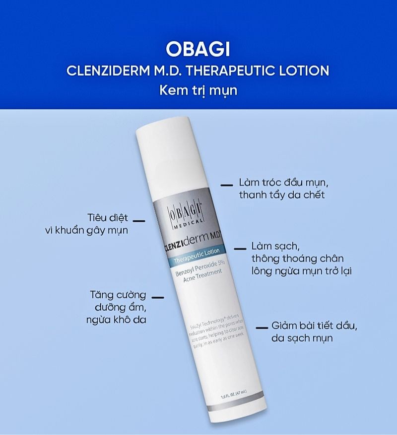 Kem trị mụn Obagi Clenziderm M.D. Therapeutic Lotion là tác động trực tiếp lên các nốt mụn, nhờ Benzoyl Peroxide làm xẹp và giảm đỏ tấy, đồng thời kem sẽ thẩm thấu sâu vào trong nang lông, giúp giảm mụn và vi khuẩn gây mụn cấp tốc, đem lại làn da trắng sáng, mịn màng và khỏe mạnh hơn.