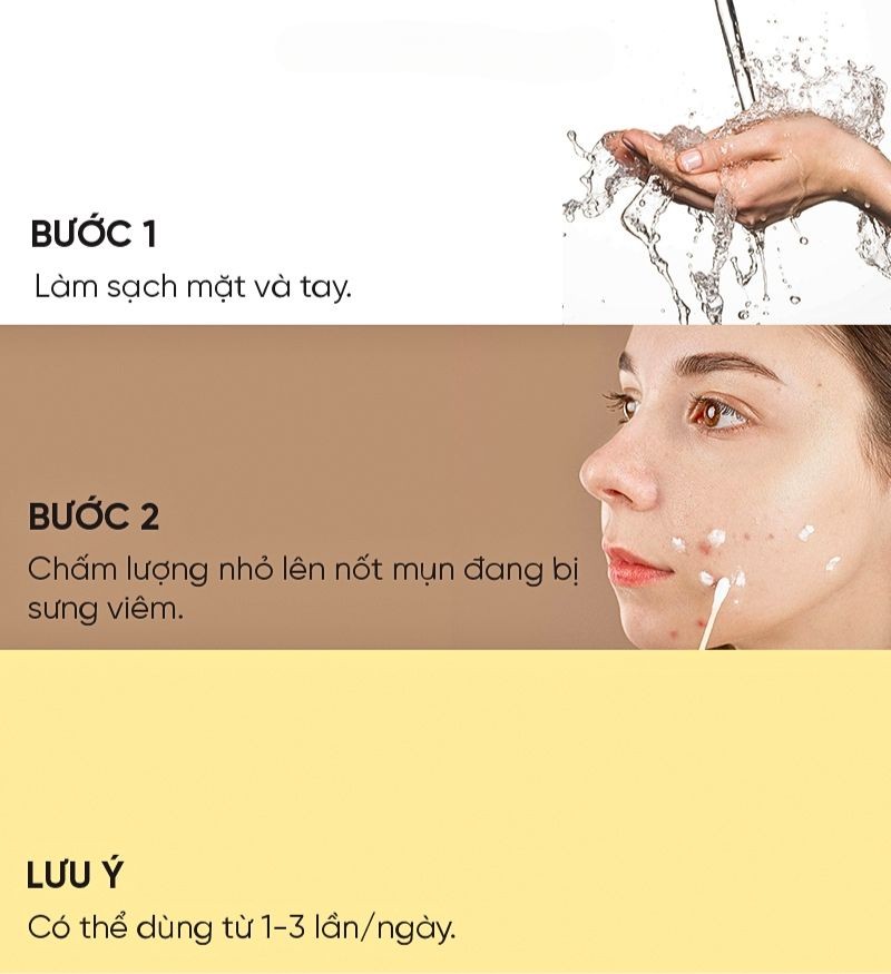 Cho một lượng vừa đủ kem (theo chỉ định của chuyên gia da liễu) vào đầu ngón tay, thoa đều khắp mặt, trừ vùng mắt, mũi và môi.