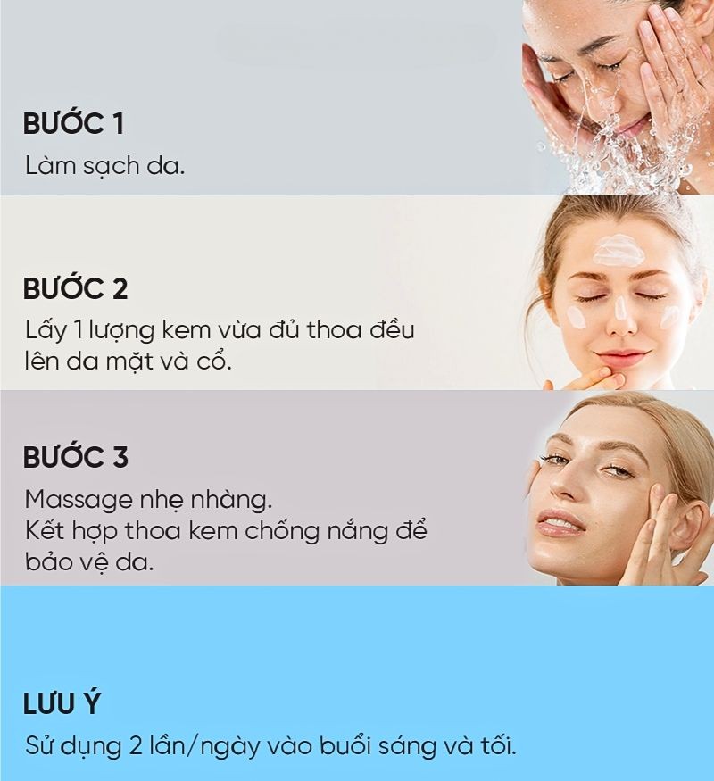 Sử dụng 2 lần/ngày vào buổi sáng và tối. Dùng kem chống nắng trước khi ra ngoài nắng để mang lại hiệu quả chăm sóc da tối ưu.
