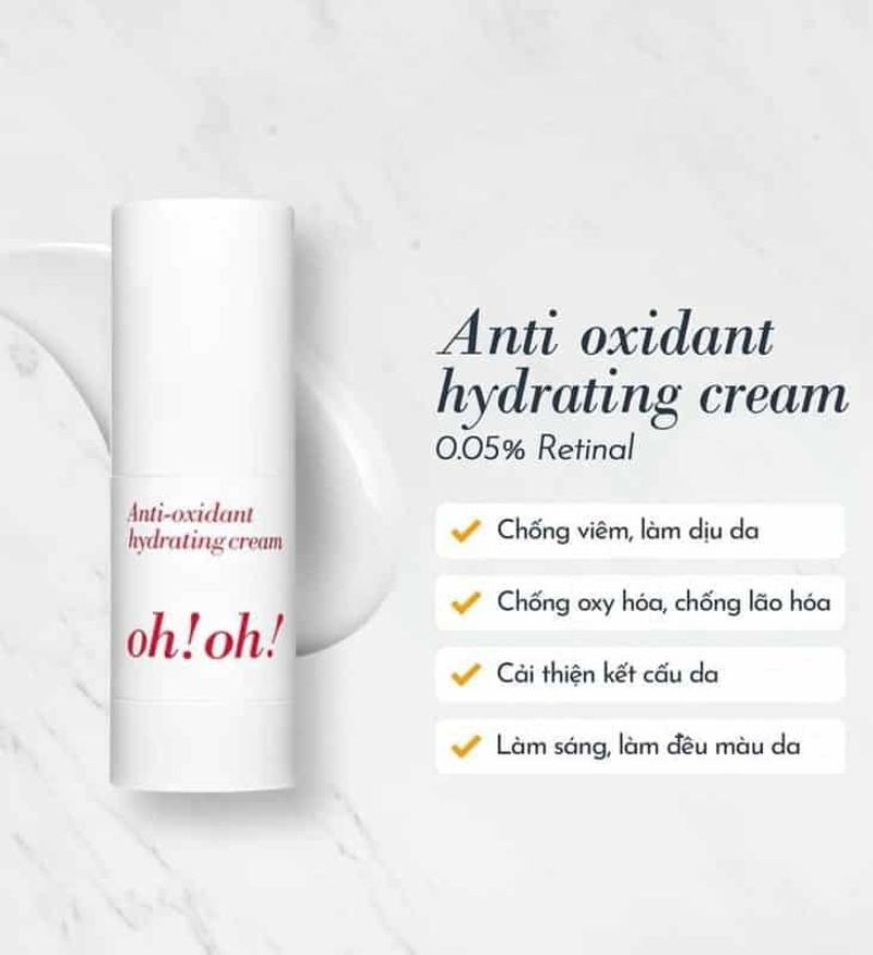 Nhờ vào công thức không chứa Paraben và khả năng giảm kích ứng trên da. oh!oh! Anti-oxidant Hydrating Cream nổi bật với khả năng chống lão hóa, giảm thiểu nếp nhăn, tăng cường độ đàn hồi và săn chắc của làn da. Ngoài ra, kem còn giúp làm sáng da, giảm tình trạng da không đều màu và đốm sắc tố, cung cấp độ ẩm cao giúp da căng mướt mịn màng, và hỗ trợ phục hồi các hư tổn trên da.