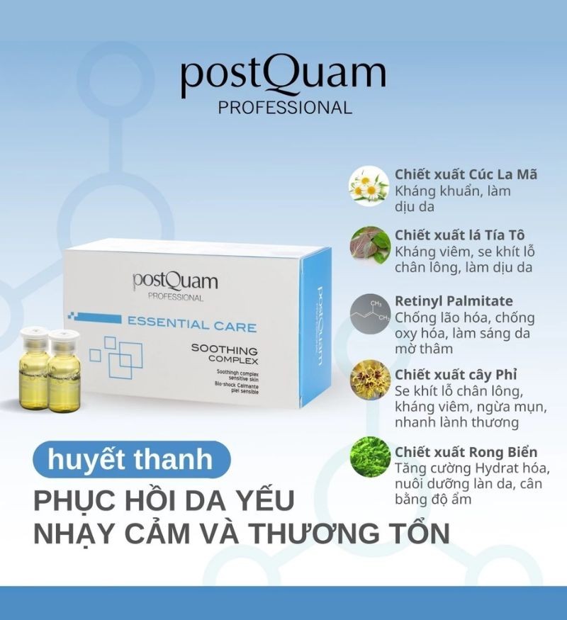 Xuất xứ từ thương hiệu PostQuam của Tây Ban Nha, huyết thanh PostQuam Soothing Complex Sensitive Skin được thiết kế dưới dạng ống cô đặc, là giải pháp đột phá để phục hồi, cung cấp dưỡng chất và độ ẩm cho những làn da yếu, tổn thương do tác động từ môi trường hoặc sau các liệu trình da liễu.