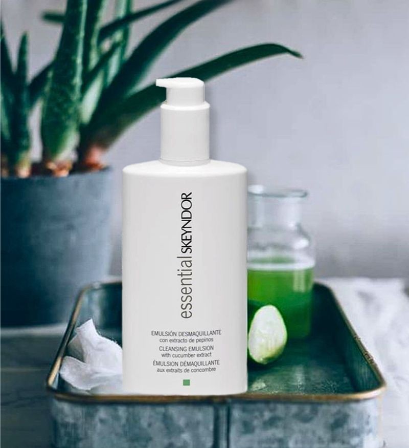 Skeyndor Cleansing Emulsion With Cucumber Extract thuộc dòng Essential của thương hiệu đình đám Skeyndor. Sữa rửa mặt được bào chế với công thức có chứa các tinh thể chiết xuất từ dưa leo, đem lại sức mạnh làm sạch tuyệt vời 2 trong 1. Giúp len lỏi vào sâu bên trong lỗ chân lông, dễ dàng làm sạch hoàn toàn bụi bẩn, bã nhờn và cặn trang điểm như kem chống nắng, cushion,...thậm chí mascara không thấm nước nhưng vẫn giữ lại độ ẩm tự nhiên của da.