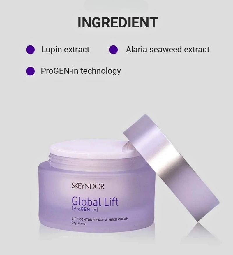 Skeyndor Lift Contour Face & Neck Cream nằm trong dòng sản phẩm ngăn ngừa lão hóa mạnh mẽ nhất từ trước đến nay – GLOBAL LIFT, được Skeyndor nghiên cứu và lấy cảm hứng từ những liệu pháp trẻ hóa và chống lại các chỉ dấu lão hóa tiên tiến nhất trên thế giới. Kem dưỡng này nổi bật với công nghệ ProGEN-in độc quyền, giúp kìm hãm sự phát triển của progerin – loại protein đột biến làm tế bào lão hóa rất nhanh chóng. Cùng hàng loạt thành phần giàu dưỡng chất cho tác dụng tái tạo tế bào mạnh mẽ. Từ đó, xóa mờ mọi dấu hiệu lão hóa như nếp nhăn, chùng nhão, chảy xệ,...thúc đẩy độ đàn hồi tối ưu cho da lấy lại sự săn mịn, mượt mà vốn có.