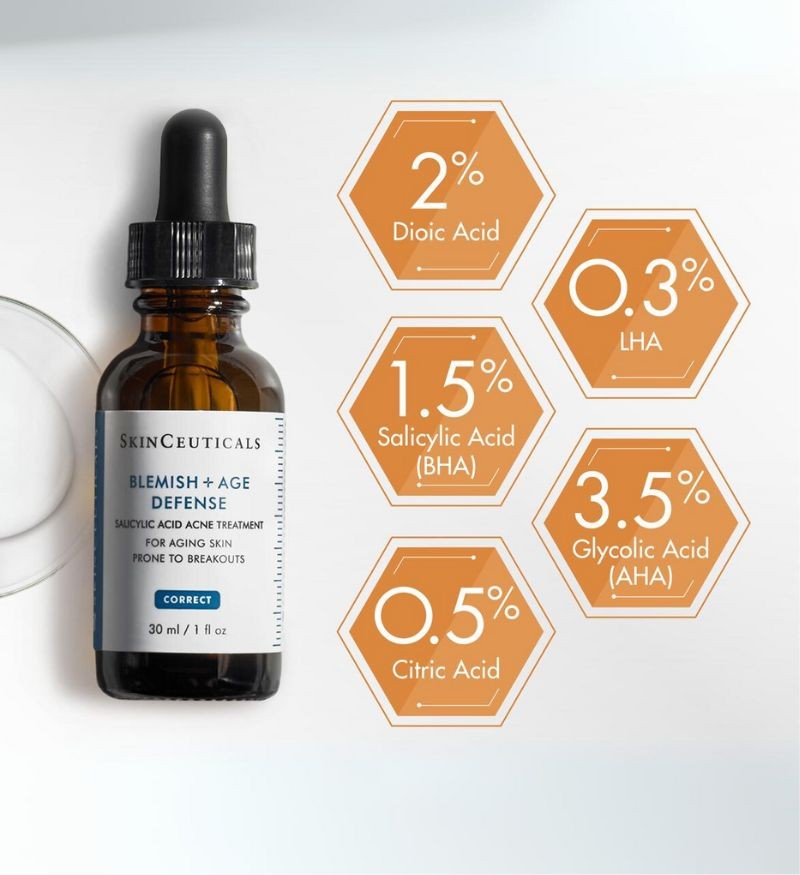 Skinceuticals Blemish + Age Defense là tinh chất điều trị mụn tiên tiến, được phát triển bởi Skinceuticals, thương hiệu mỹ phẩm hàng đầu của Mỹ. Được bào chế với công thức khoa học độc đáo, sản phẩm có kết cấu dạng serum không dầu, giúp thẩm thấu nhanh chóng vào da mà không gây nhờn rít. Đóng gói trong chai 30ml tiện lợi, tinh chất này chứa các thành phần nổi bật như 2% Dioic Acid, 0.3% Lipo Hydroxy Acid (LHA), 1.5% Salicylic Acid (BHA), 3.5% Glycolic Acid và 0.5% Citric Acid. Mỗi thành phần đều được chọn lọc kỹ lưỡng để mang lại hiệu quả tối ưu trong việc kiểm soát dầu thừa, điều tiết bã nhờn, và cải thiện các khuyết điểm sau mụn.