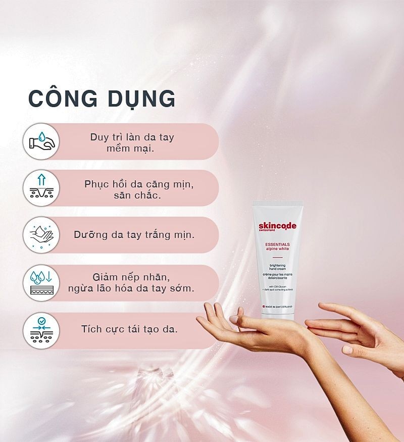 Công thức độc đáo chứa Niacinamide, phức hợp có nguồn gốc từ thực vật Alpine giúp giảm thiểu sự xuất hiện của các đốm đồi mồi. Cũng như Vitamin C và E để bảo vệ bàn tay khỏi các tác nhân môi trường mà chúng phải tiếp xúc hàng ngày. Dưỡng da tay trắng hồng, mịn màng hơn mỗi ngày. Kết cấu mịn mượt nhanh chóng thấm sâu vào da để nuôi dưỡng và hạn chế bong tróc, nứt nẻ da tay. Ngoài ra, sản phẩm còn tích cực giảm thiểu sự xuất hiện và làm mờ đốm nâu sạm đen, giúp da sáng mịn và đều màu. Đồng thời phục hồi sức đề kháng của da, tái tạo độ căng mịn đàn hồi của da tay, giảm nếp nhăn và bảo vệ da tay khỏi tác nhân gây hại từ tia bức xạ và ô nhiễm. Với Skincode Brightening Hand Cream, đôi tay của bạn sẽ được bảo vệ và chăm sóc đúng cách, từ đó giúp bạn tự tin trong mọi hoạt động hàng ngày.
