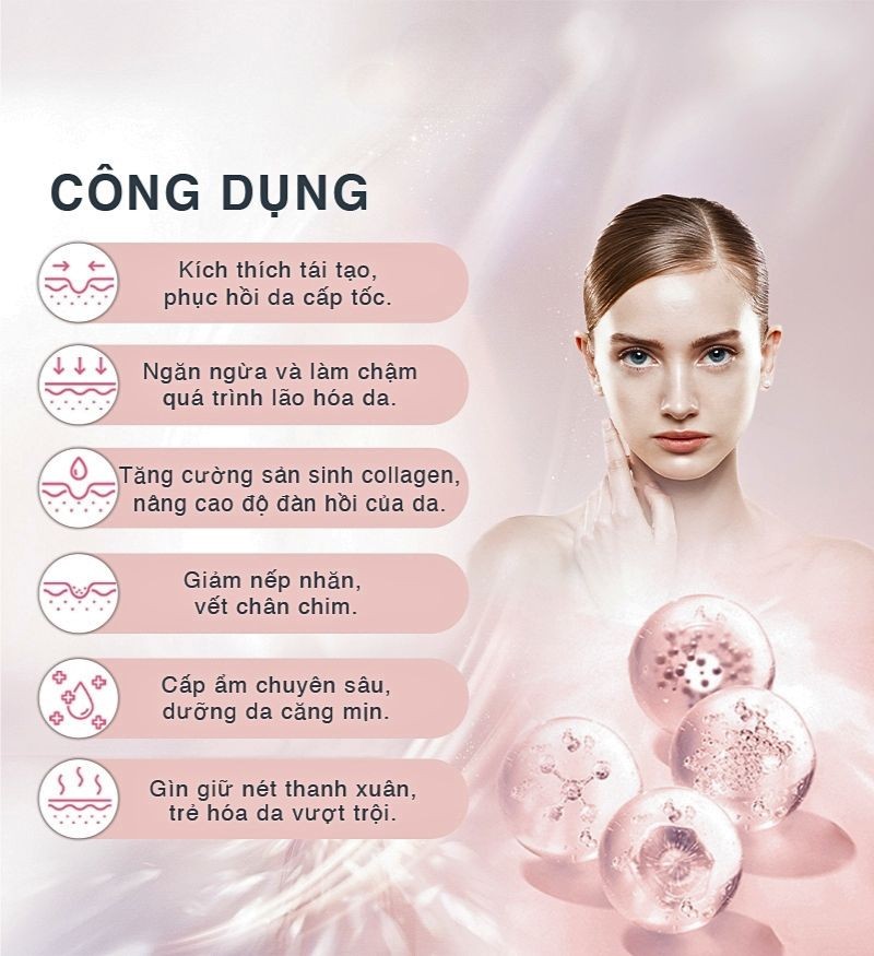 Huyết thanh phục hồi trẻ hóa da được pha chế với nồng độ gấp 5 lần Phức hợp Tái tạo Tế bào Hoạt động Độc quyền (ACR). Phức hợp ACR và Tri-Peptide kích hoạt quá trình tái tạo và đổi mới tế bào, thúc đẩy sản xuất collagen của da giúp ngăn ngừa nếp nhăn, làm chậm quá trình da lão hóa. Đồng thời cung cấp hoạt chất axit hyaluronic và tảo đỏ hỗ trợ khóa ẩm, giúp da ngậm nước, căng mượt ngay lập tức.