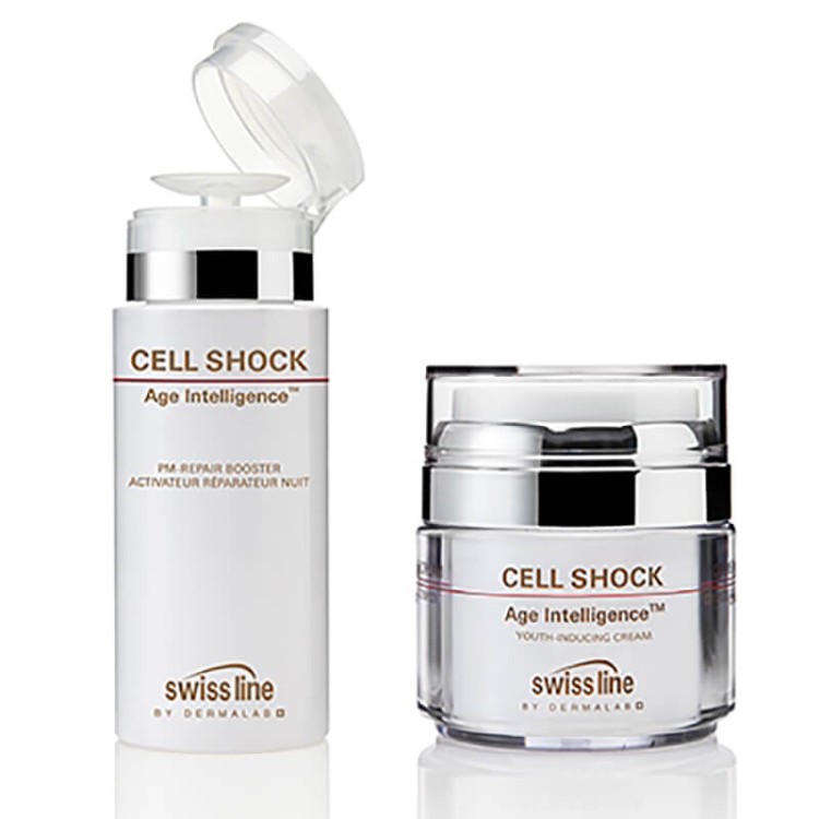 Swissline Cell Shock Age Intelligence Youth Inducing System chứa Cellactel II, tế bào gốc thực vật mầm cà phê Bengalanis, L-lysin, L-arginie, hợp chất Elastomer, Retinol, Panthenol (vitamin B5), tảo đỏ Palmaria Palmata, giúp chống lão hóa, tăng cường sản sinh collagen, tái tạo và bảo vệ da, đồng thời dưỡng trắng, làm đều màu da.