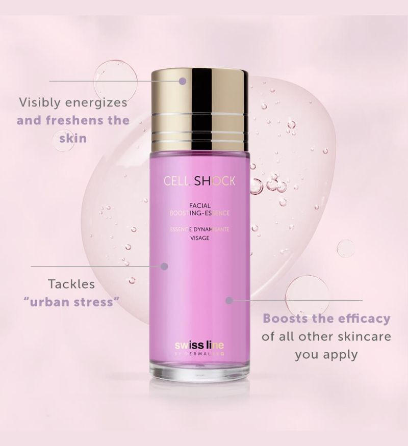 Swissline Cell Shock Facial Boosting Essence thuộc dòng Cell Shock - Bộ sưu tập chống lão hóa chuyên sâu của Swissline. Công thức essence in water (Tinh chất ở trong nước) của sản phẩm khai thác sức mạnh của chiết xuất nho, chiết xuất kombucha và phức hợp giải độc đô thị Urban-Detox. Để cung cấp năng lượng và làm tươi mới rõ rệt cho làn da, đồng thời tăng cường tính đàn hồi và mềm mại của da. Không chỉ là một loại dưỡng da thông thường, công thức của Facial Boosting Essence còn giúp tăng cường hiệu quả của tất cả các sản phẩm khác.