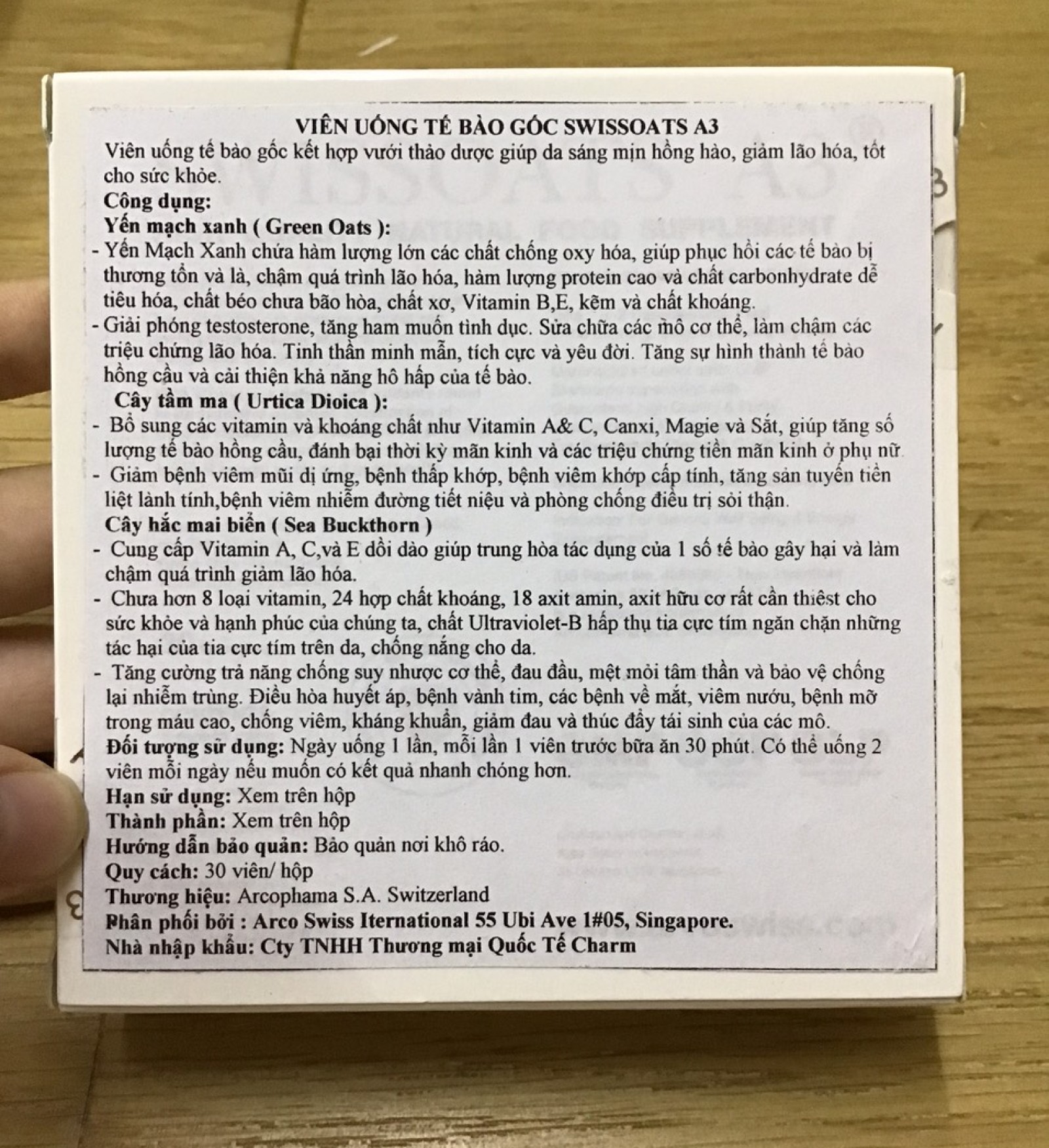 Swissoats A3 - Viên uống trắng da tế bào gốc chứa thành phần chiết xuất từ tế bào thực vật tự nhiên như hắc mai biển, yến mạch xanh…Nhờ đó giúp dưỡng trắng da, ngăn ngừa lão hóa, tăng cường sức khỏe bền vững theo năm tháng.