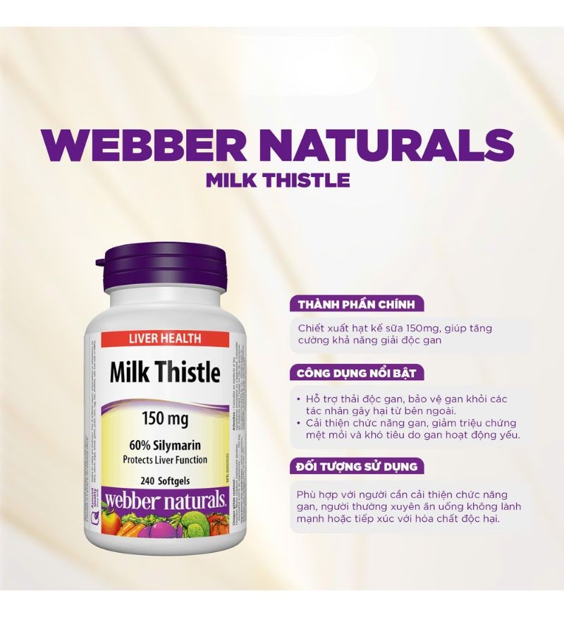 Với tác dụng giải độc mạnh mẽ, Webber Naturals Milk Thistle giúp loại bỏ các độc tố tích tụ trong gan do các tác nhân bên ngoài như rượu bia, thuốc lá, và môi trường ô nhiễm. Đồng thời, sản phẩm cũng hỗ trợ điều trị các bệnh lý liên quan đến gan như viêm gan, gan nhiễm mỡ và xơ gan, giúp gan hoạt động khỏe mạnh, duy trì sự cân bằng và cải thiện sức khỏe tổng thể.
